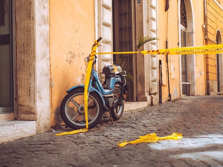 [Image description: Along a cobbled street, a blue motorbike is leant against an orange wall with some long leaves strapped to the back of it. There are grand, white arch doorways behind the bike, along the wall it is leaning against. Yellow, crime tape is tied to the handlebar and pulled across the street to the right, out of the picture. The tape is slightly torn but reads ‘Polizia Roma’ in capitals.]